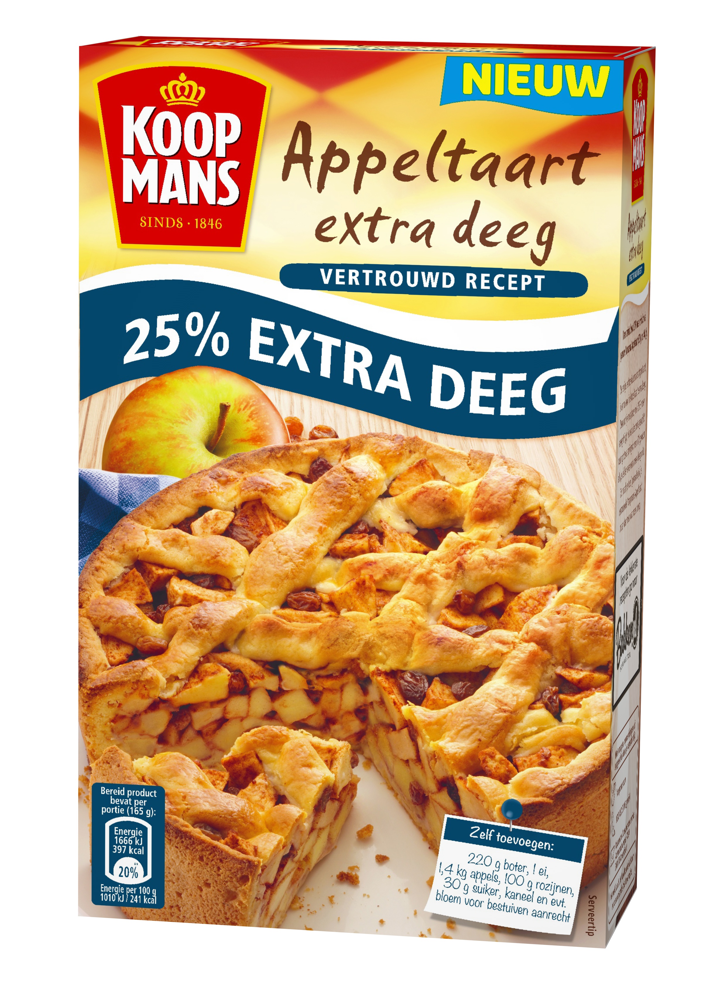 ‘Zoals meer deeg om te gebruiken bij het bakken van een appeltaart. De gemiddelde thuisbakker heeft een springvorm van 24 en 26 cm en dan kom je soms nét een beetje deeg tekort. Met Koopmans Appeltaart Extra Deeg is dat probleem nu opgelost. Een topinnovatie, al zeg ik het zelf, welke bijdraagt aan de groei in de categorie.’