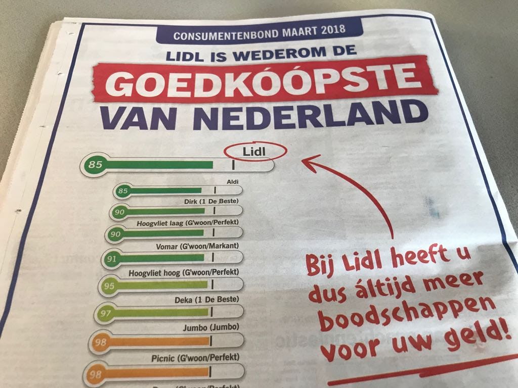 AMSTERDAM - Discounter Lidl pronkt in de landelijke media met de uitkomst van de prijspeiling supermarkten van de Consumentenbond die eerder deze week naar buiten kwam. 'Bij Lidl heeft u dus áltijd meer boodschappen voor uw geld', is de conclusie.