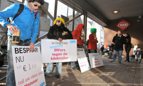 AMSTERDAM - Vier bekende Nederlanders, onder wie cabaretier Dolf Janssen (links op de foto) hebben dinsdag actie gevoerd bij C1000 't IJ in Amsterdam.