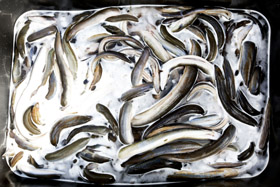 AMSTERDAM - Vrijwilligers van Greenpeace plakken deze week stickers op palingproducten bij Deen en Dekamarkt.
