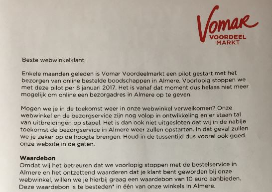 ALMERE - De regionale supermarktketen Vomar stopt in Almere met het bezorgen van online bestelde boodschappen.