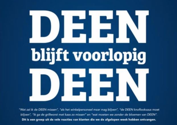 HOORN - Deen heeft na het bekendmaken van de verkoop van zijn winkels een advertentie gelanceerd waarin de formule aan de klanten duidelijk maakt dat Deen voorlopig nog blijft bestaan.