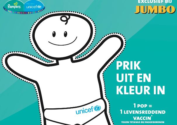 VEGHEL - Klanten van Jumbo kunnen vanaf woensdag 5 tot en met 12 oktober Unicef steunen in de strijd tegen tetanus bij pasgeboren baby's en jonge moeders. Daarnaast liggen bij iedere Jumbo prikplaten.