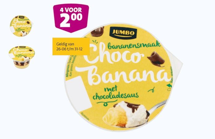 VEGHEL - Jumbo past na een golf van klachten de verpakkingen aan van het toetje Jumbo bananensmaak Jumbo Banana (met chocoladesaus).